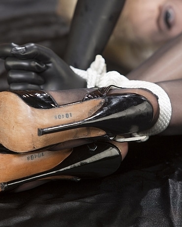Okay, having explained how these lovely shoes came to be at our shoot in the cheesecake section today, I won't do it again... if you want to know, go over and check it out. Alrightee... moving on, having decided that I wanted to have her wear the shoes (of course), I decided that I wanted a position that really featured them - and because Mosh is so flexible, I thought why NOT tie her hands to her ankles. It's sexy and quite frustratingly inescapable. Plus she gets to look at her shoes... just about all the time ;)