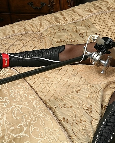 Poor Paris. She is all glommed-up up and no where to go. Dressed in a black corset, pantyhose, knee-lengthed ballet boots and gloves, she is very tightly spreadeagled to the bed. A vibrator has been placed between her legs and she can’t get away from it. Jim lets her enjoy herself for awhile, and then enters and gags her with a black ball gag. Jim lets her squirm so more and then enters and takes control of the vibrator for an orgasm, then he reattaches it and leaves her to struggle and come. Yummy. Photo Set: wmbc20071201-2