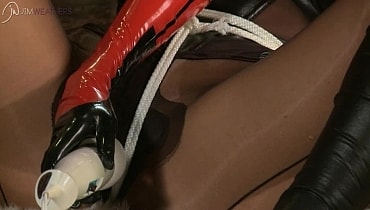 Kendra and Randy are at it again. This time Kendra is in control. And they are both dressed to impress. Kendra in a sheer black bodystocking and skin-tight latex, with a pair of locked stiletto ankle boots thrown in for good measure and Randy in an equally sexy sexy of play wear, with lurex stockings pulled up over her sexy black nylons. Then things get very interesting. Randy is tied tightly in white rope, leaving her totally at Kendra's mercy. Randy's nipples get some attention as well as her pussy. Although before Randy can have the vibrator she must ring the bells of her nipple clamps and give Kendra's pussy some attention. She is rewarded with the vibrator. I'm not so sure after coming as many times as she does though that it would be considered a reward in her mind!