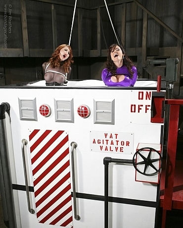 We last left Apparel Obsession girl Kelly Munroe (Emily Addison) when she was just about to be crushed by a spike wall (wmbcv-0758). O-girl (Christina Carter) and Nylonika (Kendra James) arrived just in time to save her, but unfortunately they fall victim to Lady Lovelace's (Diana Knight) tangle wire and are caught! Kelly manages to escape with her life. Afraid the police will arrive before O-girl and Nylonika perish in the tangle wire, Lady Lovelace decides to transport them to a safe location. They soon find themselves tied and trapped up to their knees in a giant vat of white powder. Lady Lovelace flips a switch on the vat which begins to vibrate the white powdery sand. O-girl and Nylonika instantly feel the nerves in their legs come alive. The strange sand! Lady Lovelace explains that the white powder is her latest creation called Shiver-sand. It stimulates the nerve endings when it moves. She then releases the ropes holding O-girl and Nylonika to the ceiling and the pair slowly sink into the vibrating sand. As soon as their crotches hit the sand, the effect is instantaneous. The girl writhe and squirm and are quickly brought to orgasm in the vibrating sand. The vat then shuts off, which causes the sand to congeal around their bodies like cement. Lady Lovelace explains that the machine will cycle between inescapable packed sand and a slushy quicksand like substance that after a number of cycles will completely overwhelm their nervous systems. Can our helpless heroines survive?