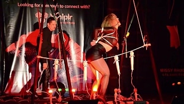 FetishCon 2015 Jim was asked to do a show demonstrating his skills. Who better to help him out than the ever stunning Angela Sommers. She loves being on stage! He ties a harness around her breasts before securing her elbows together behind her. To the right of her you can see some type of contraption. What does Jim have in mind for Angela? It’s a rope of vibrators! He shoves a gag in her mouth unexpectedly and has her straddle the vibrators. He raises the rope into her crotch. He flips a switch and the vibrators come alive one at a time! You can see she begins to grind her hips on the vibrating line. So far they have 2 vibrators on…. oh that’s 3! He gets her on her tip toes and turns on another vibrator…. walk the line Angela. You can’t really hear Angela over the music playing but trust me! By the way her body is moving she is orgasming! A lot!