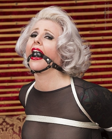 The lovely Amelea makes her first Cafe appearance and it is as sexy as hell. Dressed in a tight black leather skirt, sheer top, leather gloves, and sheer nylons, She struggles her way through the first part of the video. Jim enters and adds a ball gag and then shows her what the true power of bondage is - a whole load of helpless pleasure. She is more than ready for that. Great orgasmic bondage at its best.