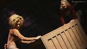 Lady Felina (Diana Knight), Fifi (Karina) and the kittens (Dee Williams and Jewel Evans) wheel in the bondage box containing the newly aquired Dr. Rush (Mary Jane) into the dungeon. They unbox her and find that she is still stubbornly refusing to reveal the formula to her love potion. Lady Felina tells Dr. Rush that she will rue her decision not to cooperate and instructs Fifi to make her "suitably uncomfortable". Fifi does just that. Dr. Rush finds herself in the stocks with a crotch rope attached to a slowly filled container. A ratchet makes sure that if she moves, the machine will only tighten. They leave Dr. Rush to struggle in her ever tightening dilemma.