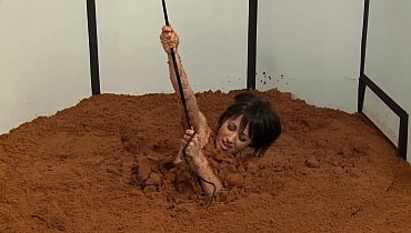Slowly the plank begins to retract into the wall. Barbara throws her remaining shoe away and carefully climbs to her feet, slowly stepping back as the plank disappears into the wall. Eventually, she has no other option but to step down into the quicksand. She slowly sinks, struggling to no avail; trying to stay afloat in the thick mire. She sinks all the way to her nose before she is saved by a rope that is lowered down. She grabs it for dear life and is slowly pulled upwards out of the quicksand to safety.