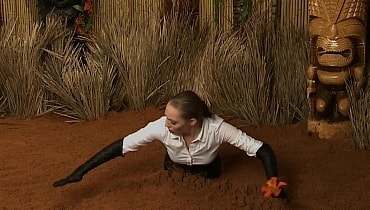 John Willie’s innocent Sweet Gwendoline (Sara Liz) is out roaming the jungle when she comes across a beautiful flower. She is so intrigued by this bright flower that she MUST have it. She doesn’t notice herself sinking in quicksand as she admires the brilliant flower. It smells so intoxicating. She tries to return to whence she came when she notices she can’t move! What’s happening? She is so confused. Panic strikes as she realizes she’s STUCK! Oh heavens, poor Gwendoline - that stupid flower has really got her in a mess. She’s screams for help but there is no one there. That big mean looking Tiki God sure isn’t saving Ms. Gwen as she sinks to her demise!