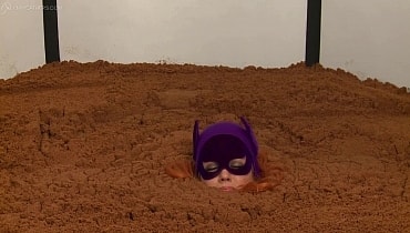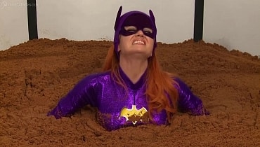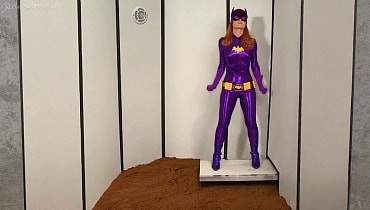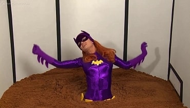 Batgirl (Angela Sommers) finds herself in a darkened room, the lights come on and she realizes she is standing on a platform inside a chamber with a sandy bottom. Catwoman (Emily Addison) introduces her predicament. Under the platform that Batgirl is standing on is a pit filled with her specially formulated quicksand. After taunting Batgirl, Catwoman throws a switch and the platform begins to slowly recede. Batgirl is helpless as it slowly disappears beneath her. Finally, Batgirl has no choice but to step into the deadly muck. She sinks from her ankles to her nose, her struggles squelching in the inescapable quicksand as it slowly consumes her. Another great damsel in distress performance from Angela. Great stuff for fans of superheroine peril and quicksand fans alike.